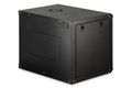 Die Netzwerkschränke zur Wandmontage der Dynamic Serie wurden für einen einfachen und besonders kostenoptimierten Netzwerkausbau entwickelt. Dach, Boden und Rückwand eines jeden Schrankes sind mit einem vorgestanzten Kabeleinlass ausgestattet. Für die Aufnahme eines Lüftermoduls wird das Dachchassis ebenfalls mit einem ausgestanzten Bereich versehen. Zwei Paar galvanisierte, mit in beide Richtungen ablesbare Höheneinheiten beschriftete 483 mm (19")-Profilschienen sind im Inneren verbaut. Diese lassen sich in der Tiefe verstellen. Jeder Schrank ist eine robuste Stahlkonstruktion aus bis zu 1,5 mm starkem Stahlblech. Die Farbgebung erfolgt in Form von elektrostatischer Pulverbeschichtung in den Standardfarben Grau (RAL 7035) und Schwarz (RAL 9005). Abnehmbare Seitenwände sowie die abschließ- und abnehmbare Fronttür, verbessern die Zugänglichkeit. Ein Türanschlagswechsel kann vorgenommen werden. Die Wandmontage erfolgt in zwei einfachen Arbeitsschritten: Das mitgelieferte Montageblech wird an die Wand geschraubt und im Anschluss mit dem Gehäuse verbunden.